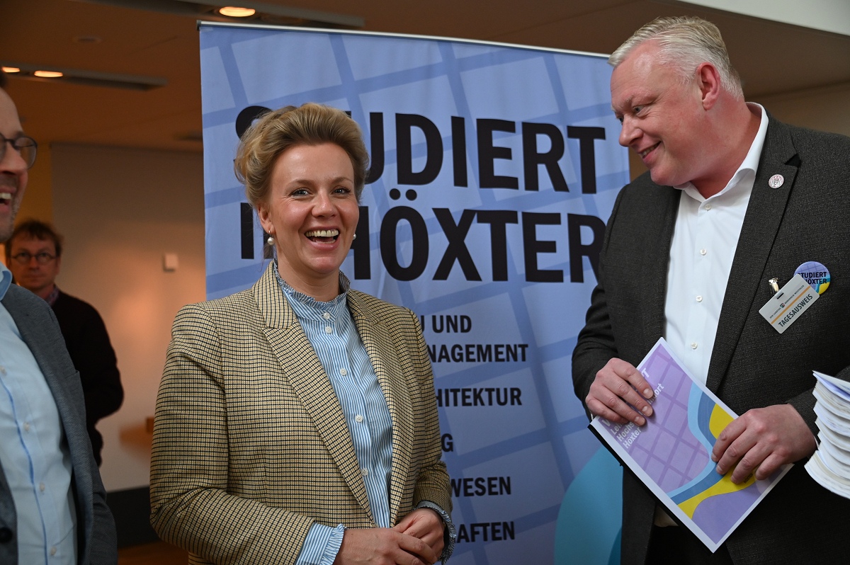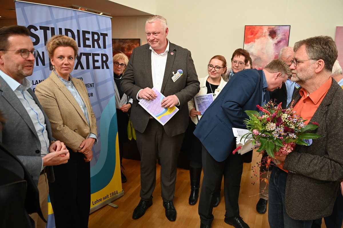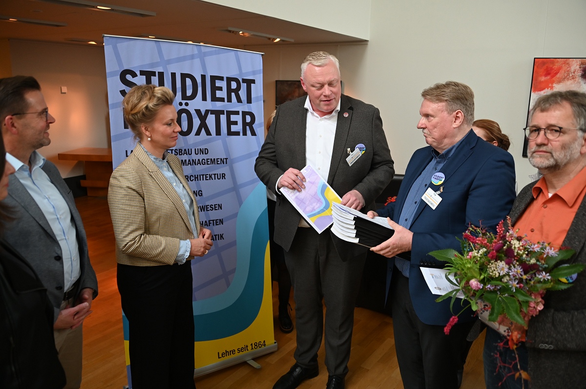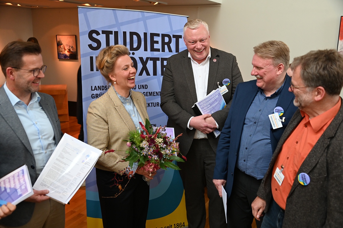 Aber damit nicht genug: Konstruktiv setzte sich der Aktionskreis Lehre am Hochschulstandort Höxter in den zurückliegenden Monaten auch mit der in der „Campus Corvey-Studie“ aufgetauchten Kritik an der Attraktivität des Standortes für Studierende und Lehrende auseinander. Allen Akteuren ist dabei bewusst, dass die vielen Vorteile und attraktiven Infrastrukturen, die Höxter schon heute bietet, intensiver beworben werden müssen. Unterstützt von Landrat Michael Stickeln und Bürgermeister Daniel Hartmann wurden in Ergänzung dazu erste Maßnahmen erörtert oder angeschoben, die als „weiche Faktoren“ das Studium in Höxter noch attraktiver machen sollen. Die Maßnahmenvorschläge reichen von einem internationalen Begegnungszentrum, in dem Studierende auch feiern können, über Kleingartenparzellen für Studierende bis hin zur Vermittlung günstigen Wohnraums, Aushilfsjobs zur Teilfinanzierung des Studiums oder „Biotop-Patenschaften“. Das ist aber ein längerer Prozess, an dem künftig Studierende, Hochschule, Stadtgesellschaft und Politik an einem Strang ziehen müssen, so Bürgermeister Hartmann und AFV-Sprecher Köhne. Mit den überreichten Unterlagen wollen die Initiatoren vor allem die Landespolitik dabei unterstützen, die Umweltstudiengänge am Campus Höxter dauerhaft zu gewährleisten und zukunftsfähig zu organisieren. Zudem appellieren sie an die Landesregierung, die Umzugspläne der TH OWL nicht durch eine Finanzierung erforderlicher Gebäudesanierungen oder Neubauten in Detmold oder Lemgo zu unterstützen, während ein viel beachteter, voll funktionstüchtiger großer Campus in Höxter zur Geisterstadt degradiert würde. Die NRW Wissenschaftsministerin Ina Brandes bekräftigte am Schluss der Übergabe, dass ihr Ministerium auch weiterhin die Erhaltung des Hochschulstandortes Höxter, einschließlich stattfindender Lehre, unterstütze und von der TH OWL einfordere. Sie zeigte sich zudem sehr zuversichtlich, dass dies auch gelingen wird.