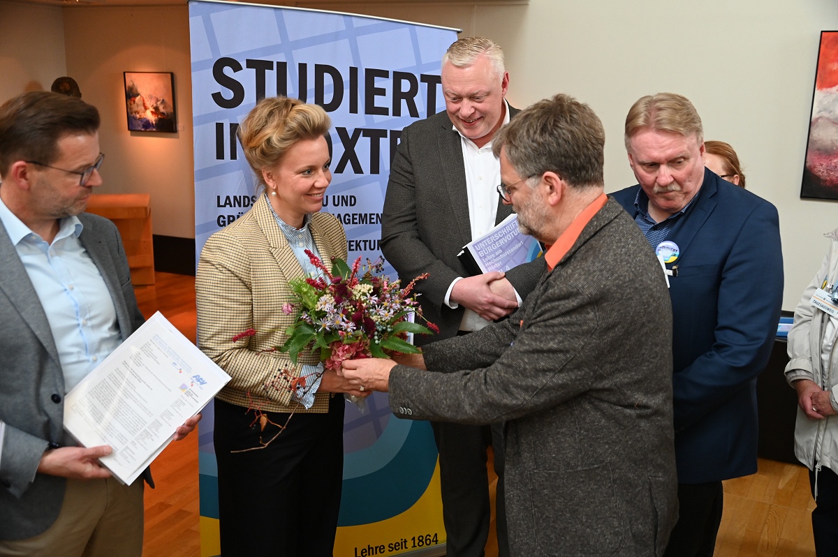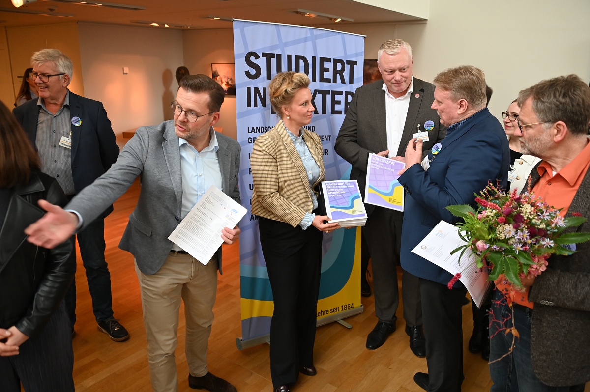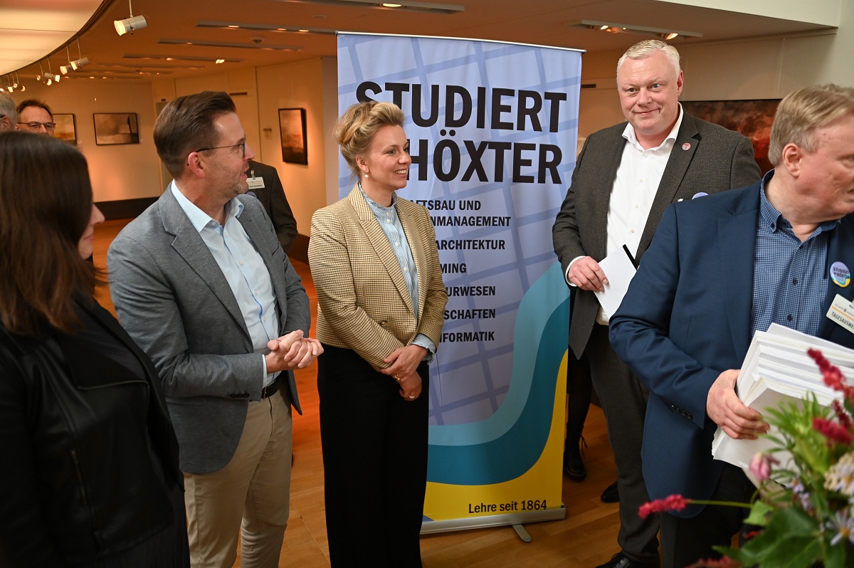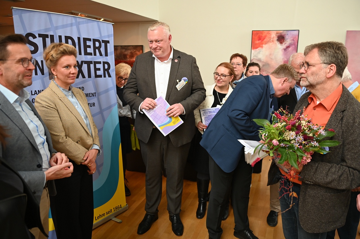 Aber damit nicht genug: Konstruktiv setzte sich der Aktionskreis Lehre am Hochschulstandort Höxter in den zurückliegenden Monaten auch mit der in der „Campus Corvey-Studie“ aufgetauchten Kritik an der Attraktivität des Standortes für Studierende und Lehrende auseinander. Allen Akteuren ist dabei bewusst, dass die vielen Vorteile und attraktiven Infrastrukturen, die Höxter schon heute bietet, intensiver beworben werden müssen. Unterstützt von Landrat Michael Stickeln und Bürgermeister Daniel Hartmann wurden in Ergänzung dazu erste Maßnahmen erörtert oder angeschoben, die als „weiche Faktoren“ das Studium in Höxter noch attraktiver machen sollen. Die Maßnahmenvorschläge reichen von einem internationalen Begegnungszentrum, in dem Studierende auch feiern können, über Kleingartenparzellen für Studierende bis hin zur Vermittlung günstigen Wohnraums, Aushilfsjobs zur Teilfinanzierung des Studiums oder „Biotop-Patenschaften“. Das ist aber ein längerer Prozess, an dem künftig Studierende, Hochschule, Stadtgesellschaft und Politik an einem Strang ziehen müssen, so Bürgermeister Hartmann und AFV-Sprecher Köhne. Mit den überreichten Unterlagen wollen die Initiatoren vor allem die Landespolitik dabei unterstützen, die Umweltstudiengänge am Campus Höxter dauerhaft zu gewährleisten und zukunftsfähig zu organisieren. Zudem appellieren sie an die Landesregierung, die Umzugspläne der TH OWL nicht durch eine Finanzierung erforderlicher Gebäudesanierungen oder Neubauten in Detmold oder Lemgo zu unterstützen, während ein viel beachteter, voll funktionstüchtiger großer Campus in Höxter zur Geisterstadt degradiert würde. Die NRW Wissenschaftsministerin Ina Brandes bekräftigte am Schluss der Übergabe, dass ihr Ministerium auch weiterhin die Erhaltung des Hochschulstandortes Höxter, einschließlich stattfindender Lehre, unterstütze und von der TH OWL einfordere. Sie zeigte sich zudem sehr zuversichtlich, dass dies auch gelingen wird.