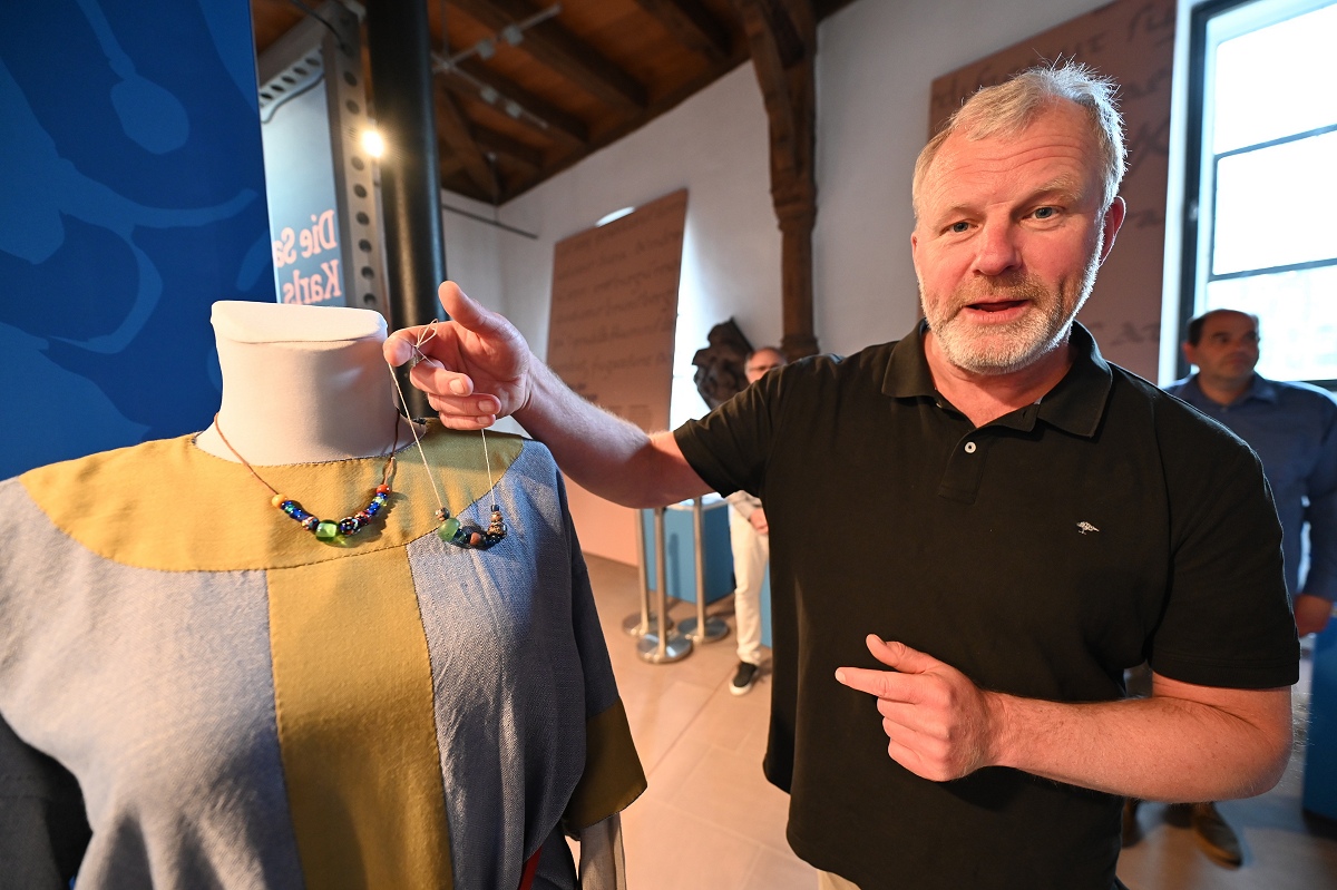 Ein Highlight der Ausstellung sind zwei digitale Erlebnisstationen mit Virtual-Reality-Technik. Diese wurden von der Firma Nusec XR aus Beverungen entwickelt. Geschäftsführer Fernando Norpoth erklärt den besonderen Ansatz: „Mit der VR-Brille stehen wir nicht bloß am Rand – wir sind mitten in der Schlacht oder bei einem Bestattungsritual dieser Epoche.“ In rund dreiminütigen Sequenzen können die Besucher hautnah miterleben, wie fränkische und sächsische Krieger aufeinandertreffen. Auch Begräbnisszenen, bei denen sich Angehörige der Sachsen von ihren Lieben verabschieden und von fränkischen Kriegern überrascht werden, gehören zur virtuellen Zeitreise. Nicht nur digital, sondern auch haptisch können die Besucher in die Vergangenheit eintauchen: An einem sogenannten Hands-On-Tisch dürfen frühmittelalterliche Waffen wie Spatha und Sachs, aber auch Pfeilspitzen, Rundschilde und Kleidungsstücke selbst in die Hand genommen werden. Ergänzt wird dies durch eine Vielzahl historischer Exponate: Fibeln, Orakelstäbchen, Odin-Beschläge und Alltagskeramik geben ebenso Einblick in das Leben der Menschen jener Zeit wie ein eindrucksvoll präsentierter Schädel mit tödlicher Schwerthiebverletzung, der aus Konstanz stammt. Stadtarchäologe Ralf Mahytka erläutert dazu: „Die Bruchkanten zeigen keine Heilung – das war ein sofort tödlicher Treffer.“