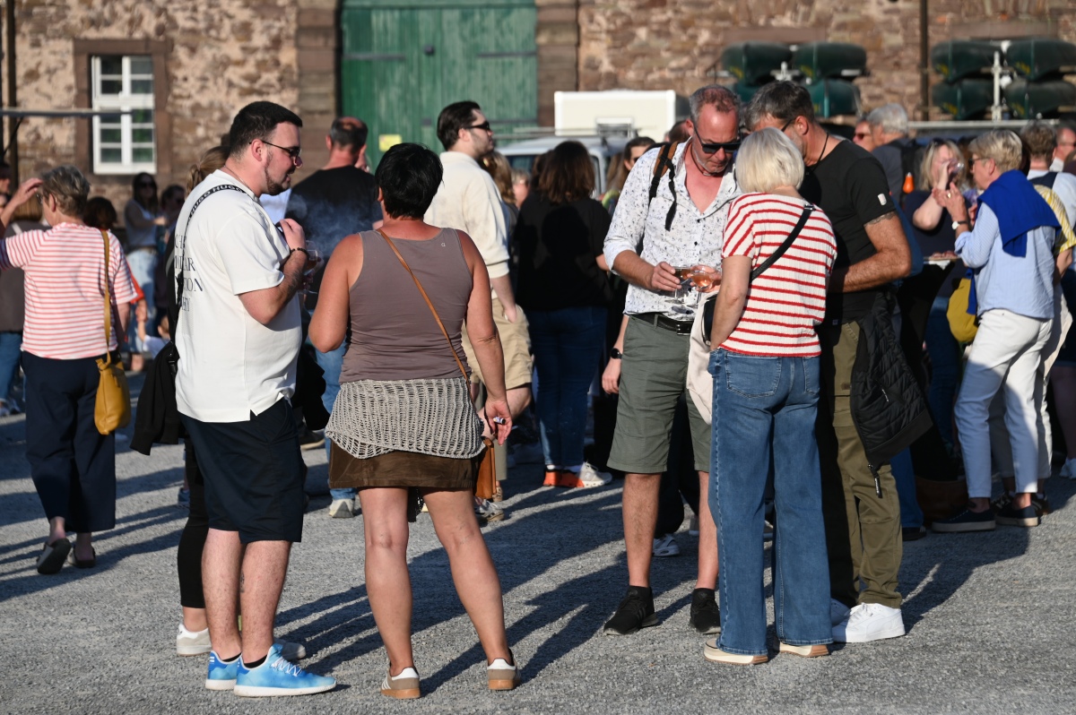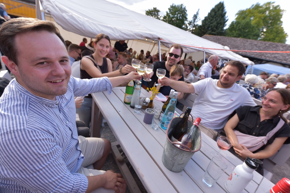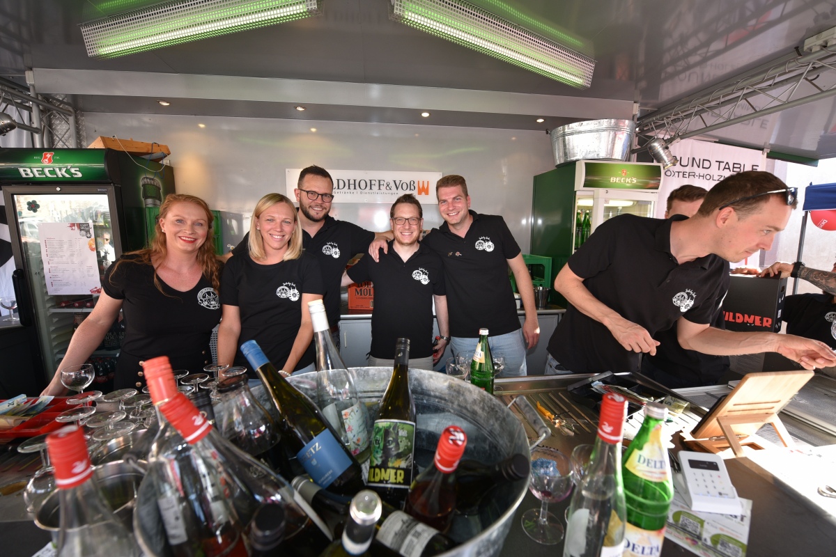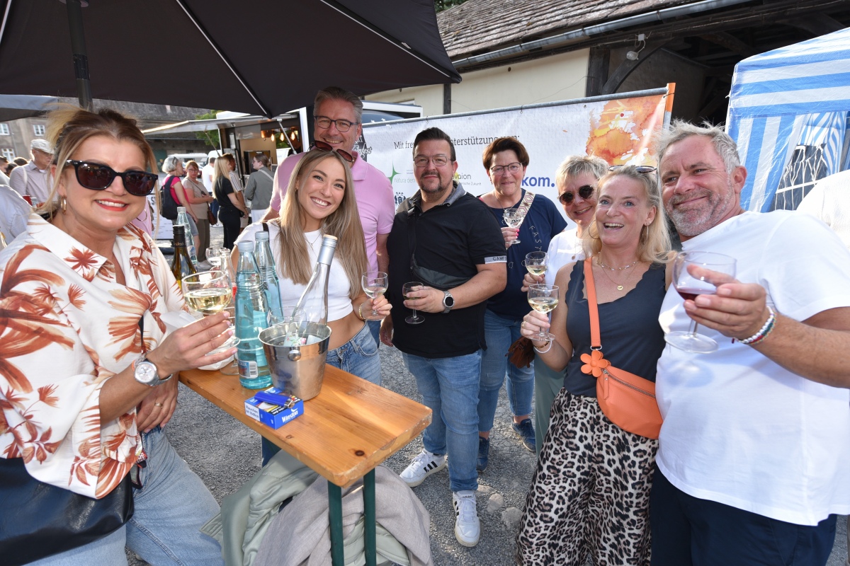 Höxter (TKu). So viele Gäste wie noch nie zog das Benefiz-Weinfest am vergangenen Samstag in den Corveyer Domänenhof: Geschätzt mehr als 1000 Besucherinnen und Besucher genossen bei erneut strahlendem Sonnenschein, gutem Wein, kulinarischen Spezialitäten und stimmungsvoller Musik das Weinfest. 1.003 Weinflaschen gingen über die Theke – im Vorjahr waren es 630. Bereits vor 16 Uhr strömten die ersten Gäste auf das Gelände vor dem Corveyer Weinhaus. Zum siebten Mal luden die Serviceclubs Ladies’ Circle 64 Höxter-Holzminden und Round Table 150 Höxter-Holzminden zu dem Fest ein, das bereits zum vierten Mal in der historischen Kulisse des Domänenhofs stattfand. „Bei traumhaftem Wetter und in malerischer Umgebung mit Blick auf das imposante Westwerk von Corvey bot sich eine ideale Atmosphäre“, meinte eine Besucherin, die ergänzt: „Die Atmosphäre des Domänenhofs passt perfekt zum Weinfest.“