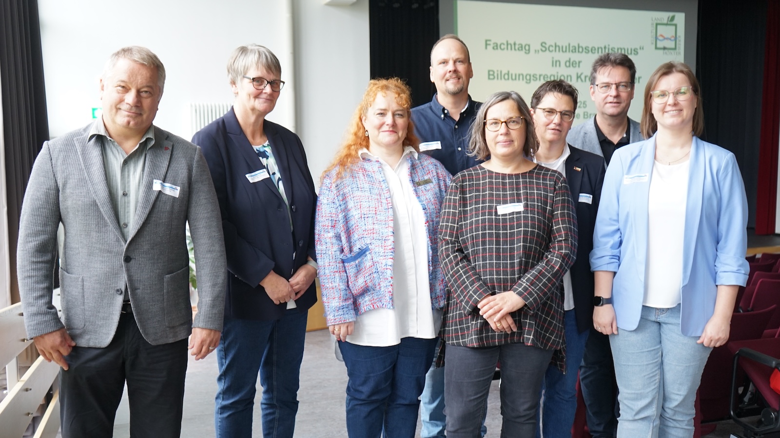 Die Referenten der Veranstaltung informierten über das Thema Schulabsentismus: (v.l.n.r.) Prof. Heinrich Ricking, Universität Leipzig, Maria Komm, Schulamt für den Kreis Höxter, Sandra Florsch, Schulleiterin Gesamtschule Brakel, Dominic Gehle, Leiter der Abteilung Bildung und Integration des Kreises Höxter, Bettina Becker (Schulleiterin, Schule am Nicolaitor, Höxter), Eva Klare-Kurtenbach (Geschäftsführerin, Kolping Schulwerk), Carsten Schulz, Leiter der Regionalen Schulberatung Kreis Höxter, Rabea Lausen, Regionale Schulberatung Kreis Höxter.